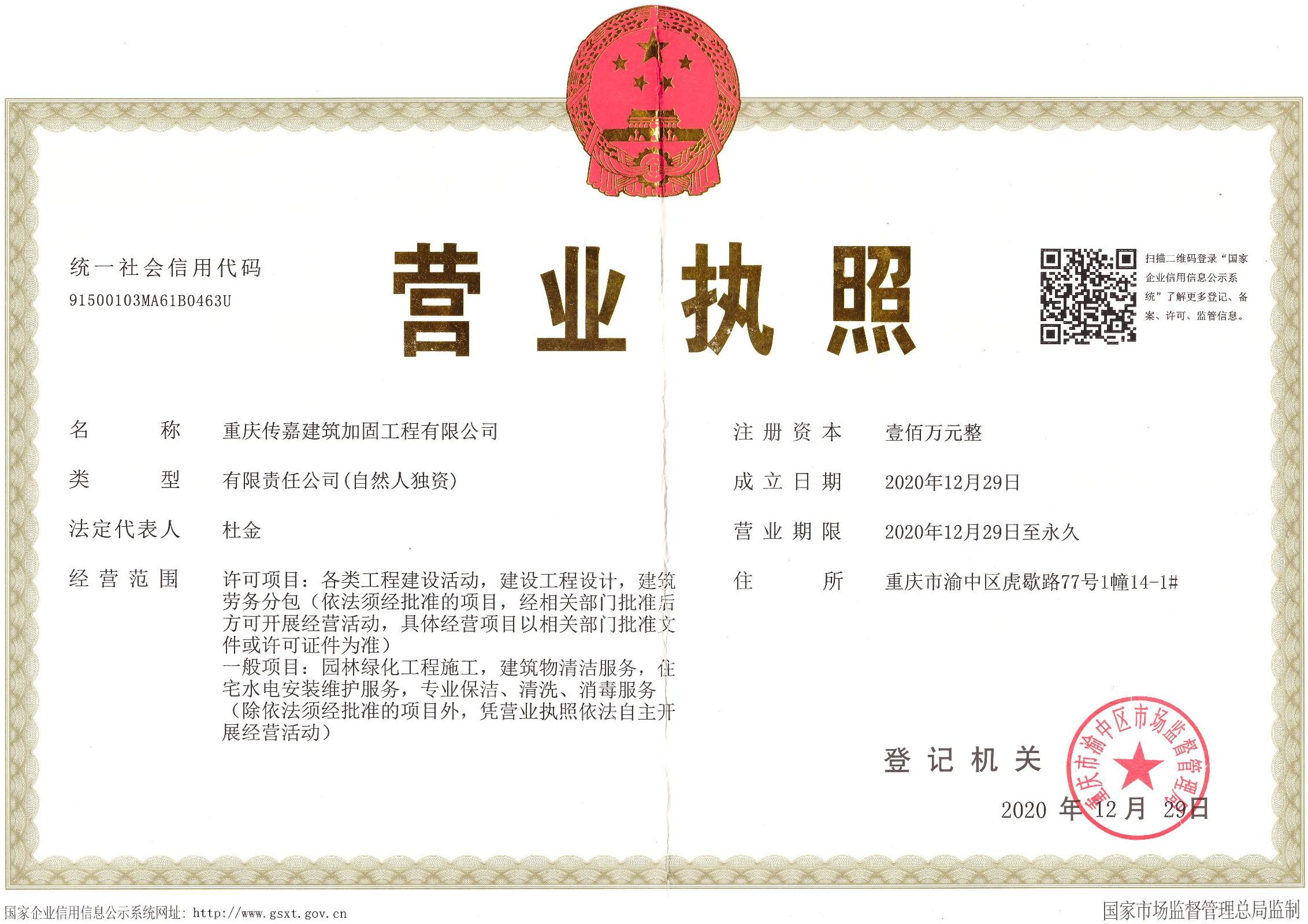 【企业概况】:重庆传嘉建筑加固工程有限公司一家专业从事房屋别墅、洋房、厂房、写字楼、跃层现浇隔层加层,房屋改造的企业,经过多年的专业施工,在施工过程中的不段学习,打造出了适用于重庆本土土建改造的先进技术。